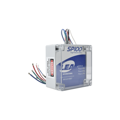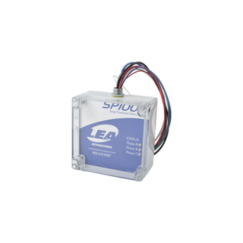 Supresor de Transitorios/Picos SP-100-120/208-3Y de LEA International. Gabinete NEMA 4 con dimensiones de 15x10x5 cm y peso de 300 g. Fabricado en aluminio anodizado negro. Diseño compacto y portátil, ideal para proteger sus equipos contra sobrecargas eléctricas y evitar daños.