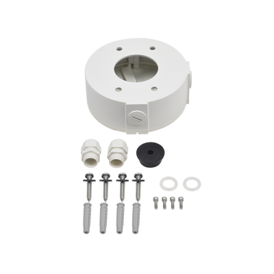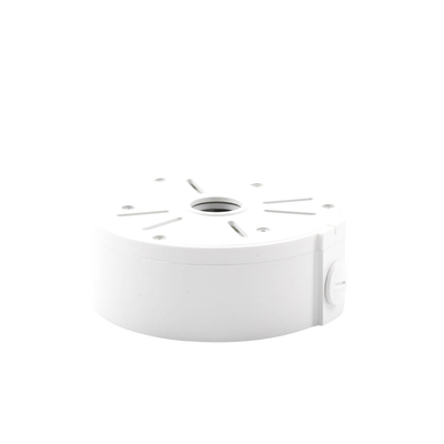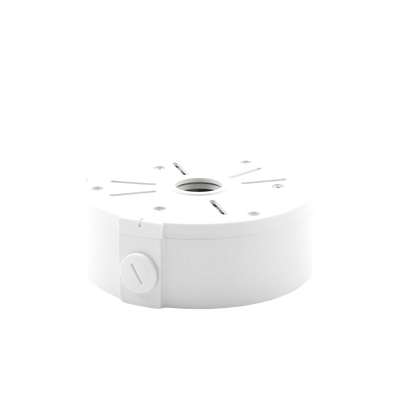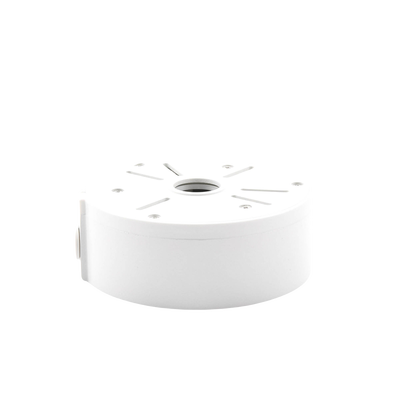 Caja de conexiones universal XGA130 de aleación de aluminio, color blanco, con dimensiones de Ø146mm * 56mm. Compatible con cámaras de tres y cuatro orificios para instalación. Incluye tubos para canalización. Esta caja de conexiones garantiza alta seguridad, evitando que queden tornillos expuestos.