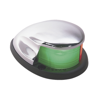 Luz bi-color 0227-DP0-CHR 12 vcd 10 watts 0.80 amperes certificado para embarcaciones de menos de 20 metros con tapa cromada. Esta elegante luz cuenta con lentes rojo y verde garantizando una visibilidad óptima y está diseñada con una tapa de aleación de zinc resistente a la corrosión.
