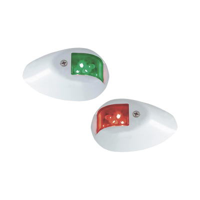 Set de luces de navegación 0602-DP1-WHT 12 Vcd 0.80A 1.2 Watts con cubierta blanca, ideal para embarcaciones a motor de menos de 20 metros. Incluye 1 luz roja y 1 verde, cumpliendo normativas de seguridad marítima. Fácil instalación con tornillo %238.
