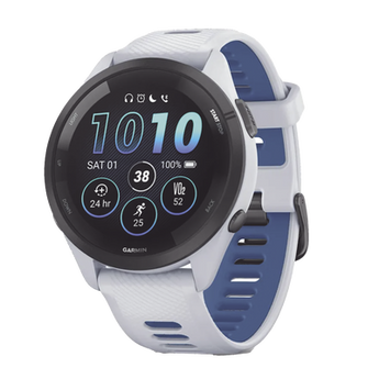 Reloj inteligente Forerunner® 265 10-02810-01, pantalla AMOLED de 1.3 pulgadas y hasta 20 horas de duración de batería. Destaca por su bisel negro con carcasa blanca y correa de silicona en blanco/azul. Incluye almacenamiento de música y receptor GPS multibanda para optimizar tu rendimiento físico en actividades deportivas.