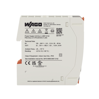 Fuente de alimentación 2687-2142 de WAGO, diseñada para un rendimiento óptimo. Con tensión de salida de 24V DC y corriente de 1.25A, proporciona un funcionamiento seguro y eficiente. Con una indicación óptica de estado y refrigeración por convección, es ideal para sistemas eléctricos en paralelo o en serie.