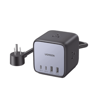 Multicontacto de escritorio 40861 UGREEN, 2 puertos USB-C y 2 puertos USB-A, 3 tomacorrientes de CA, tecnología GaN II, carga rápida de 65W PD. Diseño innovador en forma de cubo y con interruptor de apagado.