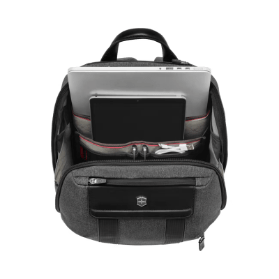 Mochila Urbana 611-955 de VICTORINOX hecha de nylon/cuero, tamaño máximo para laptop de 14%22 (35.5 cm), capacidad de 17 l, medidas de 42 cm altura, 19 cm longitud y 30 cm ancho, con peso de 1.1 Kg. Incluye prácticos portabotellas elastizados y recubrimiento antimicrobiano, ofreciendo funcionalidad suprema y organización para tus dispositivos.