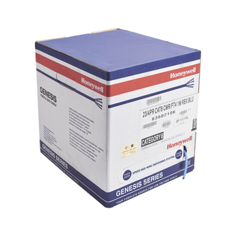 Bobina de cable 6360-2106/1000 de 305 metros UTP Cat6 de la marca GENESIS, color azul, diseñada para operar en temperaturas de -20 °C a 75 °C. Fabricado con cobre sólido y aislamiento de PVC resistente a la luz solar, este cable cuenta con 4 pares y certificaciones UL 1685, CMR, y RoHS. Ideal para sistemas de alarma y detección de fuego, garantiza conexiones seguras y estables.