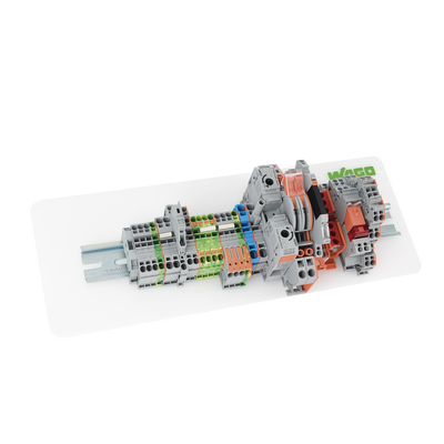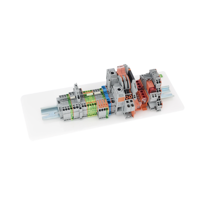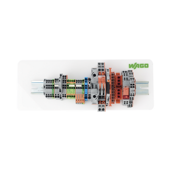 Kit de clemas 807-772 riel DIN para montaje incluye más de 20 modelos de clemas diferentes. Este kit de demostración de clemas de WAGO facilita conexiones eléctricas y mejora la eficiencia en las conexiones.