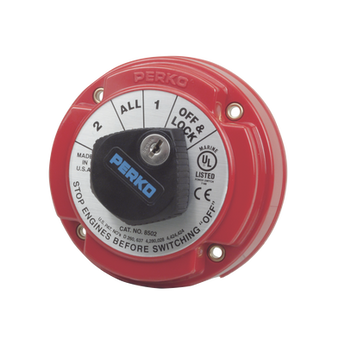 Selector de batería 8502DP 250 amperes 6-32 vcd cuerpo de policarbonato instalación fácil bloqueo con llave. Diámetro: 5.25 pulgadas, capacidad de 250 amperes continuos, voltaje de 6-32 Vcd. Interruptores selectores de batería de la serie 8501 de Perko, instalación fácil. Este switch aumenta la seguridad en la sala de máquinas de embarcaciones.