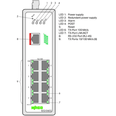 Switch Industrial Gestionable 852602 de WAGO, cuenta con 8 puertos 100Base-TX, temperatura operativa de -40 a +70 °C y alimentación redundante de 12 a 60 VCC. Esta solución ofrece almacenamiento y reenvío de datos, 16000 direcciones MAC, y compatible con estándares IEEE. Ideal para redes industriales gracias a su robustez y facilidad de gestión.