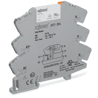 Módulo relé 857304 24 VCC 6 A IP20 indicador LED amarillo. Ofrece tensión nominal de entrada de 24 VCC, corriente permanente límite de 6 A, y un rango de tensión de entrada de -15 a +20%25. Su diseño compacto de 6 mm y construcción en poliamida (PA 66) aseguran durabilidad y un rendimiento excepcional en entornos industriales.