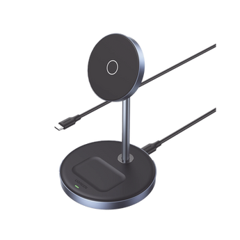 Soporte de carga inalámbrica 90668 3 en 1, carga rápida adaptativa compatible con MagSafe. Incluye luz indicadora LED, múltiples protecciones, y estructura de aleación de aluminio, ideal para iPhone y AirPods.