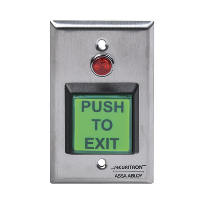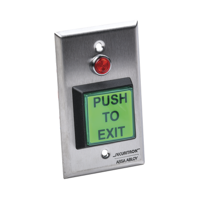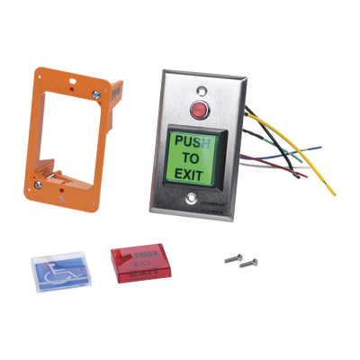 Botón Momentáneo AC-PB2 de SECURITRON-ASSA ABLOY con cubiertas intercambiables para certificaciones ADA (verde, roja y azul). Soporta hasta 5 Amp, dimensiones de 4.5%22 x 2.75%22 (114mm x 70mm) y cuenta con garantía de por vida. Fácil instalación y adaptación para diversas necesidades.