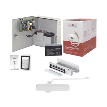 Sistema de acceso ACCESSKIT11P de SYSCOM, incluye Chapa Magnética 600lb, Cierrapuerta para puertas de 40-65kg, Teclado Antivandálico, Botón de salida y más. Ideal para controlar el acceso seguro a instalaciones con su sistema de montaje versátil y fácil instalación.