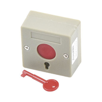 Botón de pánico para uso en casos de emergencia. Puede utilizarse para activar un sistema de alarma, sirena o puertas de emergencia. Restablecimiento con llave. Tamaño compacto para fácil instalación.
