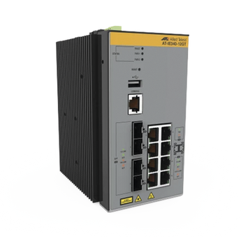 Conmutador industrial AT-IE340-12GT-980 Capa 3 8 puertos 10/100/1000T Poe+ 30W Sin ventilador Diseño robusto. Modelo IE340, tipo: conmutador de capa 3 Gigabit, temperatura de operación adecuada para entornos industriales, robusto ante vibraciones, con tiempo de recuperación de menos de 50 ms y tecnología PoE IEEE 802.3at. Incluye sistema operativo rico en funciones y gestión mediante Web GUI.