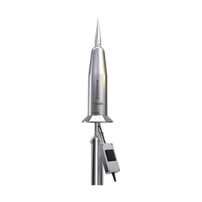 Punta pararrayo AT2560 Acero inoxidable AISI 316L IP67 -25ºC a 88ºC 60 μs de cebado trazador continuo aislante superior al 95%25. Este dispositivo, con un peso de 3,8 kg, presenta una estanqueidad IP67 y un cebado electropulsante, asegurando una anticipación en la formación del trazador ascendente y aumentando la seguridad de instalaciones ante tormentas eléctricas.