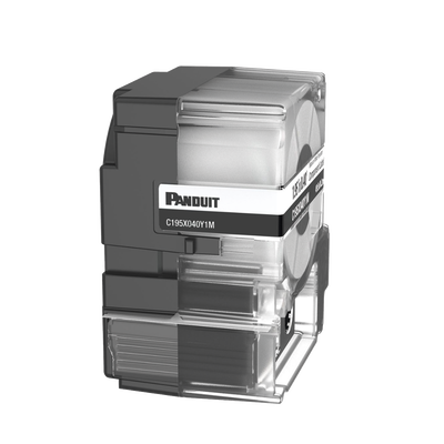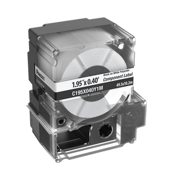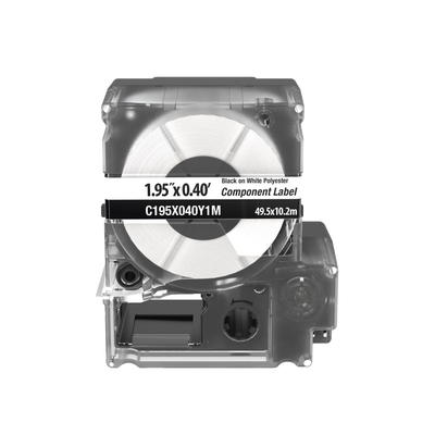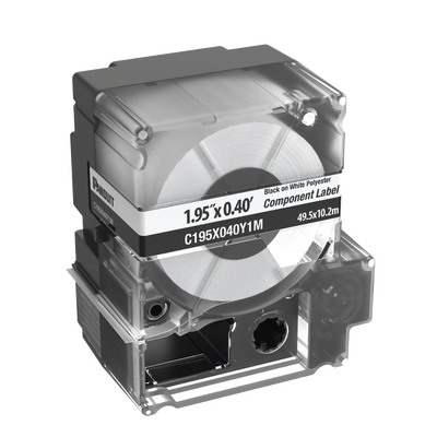 Casete de etiquetas no adhesivas C195X040Y1M de 125 etiquetas en color blanco, material poliéster, altura de 0.4 pulgadas y ancho de 1.95 pulgadas. Compatible con impresora MP300. Incluye cinta para cambio y ofrece un aspecto profesional y ordenado en identificaciones. Ideal para identificar placas de pared y equipos electrónicos. Cumple con RoHS.