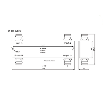 Acoplador híbrido CA-16E 350-2700 MHz 200W -161dBc IP65. Ideal para sistemas de comunicación, con frecuencia de 350-2700 MHz, 200W de potencia, aislamiento >23 dB y baja VSWR. Permite la combinación de dos operadores en un solo cable de distribución.