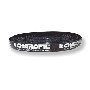 Rollo de cinta strap CH-CINTASTR25-NG de CHAROFIL, ideal para canalización y fijación. Compatible con cables UTP, STP y fibra óptica. Diseño ergonómico que sujeta firmemente sin dañar los cables. Reutilizable y permite cortes precisos para mejorar la organización de cables.