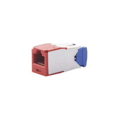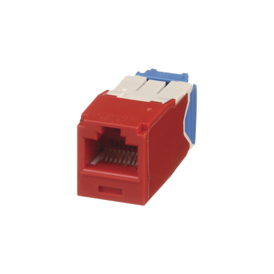 Conector Jack RJ45 estilo TG CJ6X88TGRD, categoría 6A, color rojo. Módulo de cobre Mini-Com® que no requiere herramienta para su terminación. Admite un rendimiento certificado 10GBase-T y alimentación a través de HDBaseT de hasta 100 Watts, ideal para instalaciones de cableado estructurado.