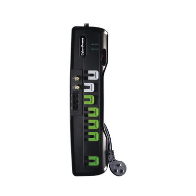 CyberPower CSHT706TC protege los equipos conectados contra sobretensiones y picos. El protector contra sobretensiones de cine en casa incluye salidas protegidas contra sobretensiones para distribuir energía a múltiples dispositivos. El producto también está equipado con protección coaxial (RG6) para proteger los cables de TV y protección de línea de datos para proteger dispositivos de telecomunicaciones como teléfonos, faxes, módems y más. El protector es adecuado para aplicaciones de cine en casa, como sistemas de juegos, televisores LCD, reproductores de Blu-Ray, parlantes de audio, reproductores de CD / DVD, amplificadores, dispositivos multimedia, computadoras personales y más.