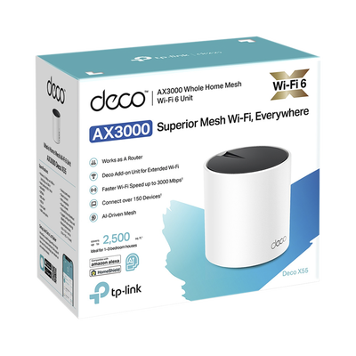 Router inalámbrico mesh DECOX55 Wi-Fi 6 3000 Mbps 3 puertos gigabit. Dimensiones: 110 x 110 x 114 mm. Roaming sin interrupciones y fácil configuración mediante aplicación móvil. Garantía de 2 años y consumo máximo de solo 16 W, excelente para mantener tu conexión estable.