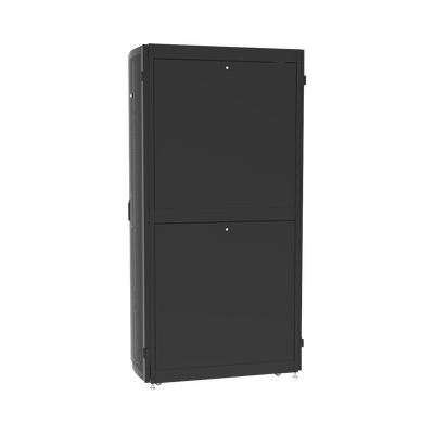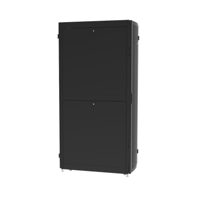 Gabinete para centros de datos DNE6212B 42u 600mm ancho 1000mm profundidad acero negro puertas con bloqueo rieles ajustables. Este gabinete robusto tiene dimensiones de 600 mm x 2045 mm x 1000 mm, fabricado en acero con recubrimiento en polvo negro, y cumple con estándares como EIA-310-E y UL2416. Ofrece una capacidad de carga estática de 3300 lb, ideal para un uso seguro y eficiente en la instalación y almacenamiento de equipos en centros de datos.