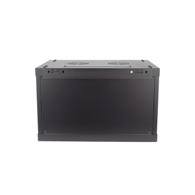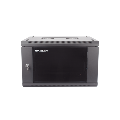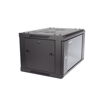 Gabinete para montaje en pared DS-XS6406-S/B 600x368x450mm 6U, soporta 40KG. Ideal para instalación en pared o piso, cuenta con ventana de cristal templado y laterales desmontables, proporcionando seguridad a los equipos.