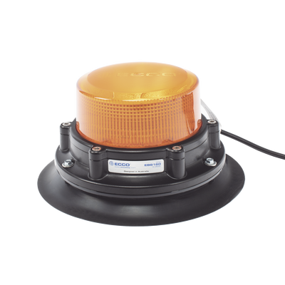 Baliza LED EB8160AVM IP69K, color ámbar, con montaje magnético. Ofrece 20 patrones de destello y cuenta con certificaciones IP67 e IP69K. Altura de 3.35 in, largo de 6.56 in, peso de 1.87 lbs. Fabricada con lente resistente a golpes y base de aluminio fundido a presión, ideal para garantizar la seguridad en entornos difíciles.