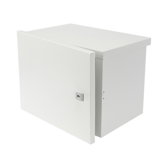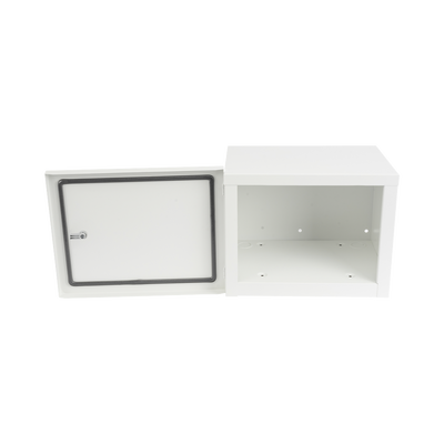Gabinete para 2 baterías PL4012 EI-PCB-04-03-03-W3 de EPCOM INDUSTRIAL, fabricado en lámina galvanizada resistente a la corrosión. Tiene una puerta con cierre por tornillo y opción de candado, herrajes para montaje (no incluido) y perforaciones para cableado. Diseñado para uso exterior, con pintura electrostática blanca.