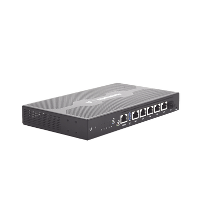 El Enrutador gigabit ER-6P de UBIQUITI destaca por sus 5 puertos Gigabit Ethernet RJ45 y 1 puerto SFP, brindando un throughput de hasta 6 Gbps y un desempeño de 3.4 Mpps. Operando con alimentación de 24 V pasivo, cuenta con un potente procesador de 4 núcleos a 1 GHz. Incorpora políticas de Firewall y NAT, Quality of Service (QoS) y ofrece un rendimiento avanzado para redes empresariales y centros de datos.