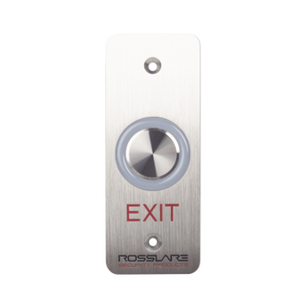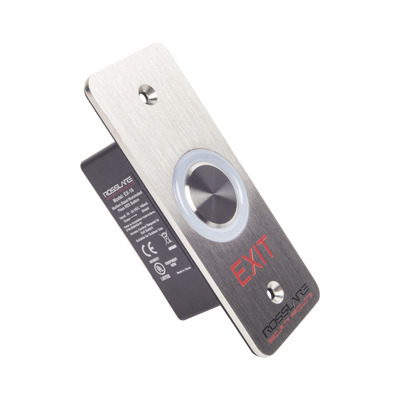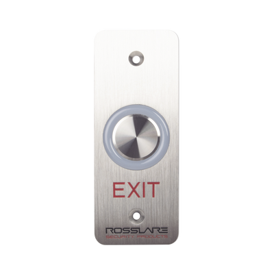 Botón de salida táctil EX-16E0 de ROSSLARE SECURITY PRODUCTS. Ideal para control de acceso con tecnología piezoeléctrica, temporizador de 1-60s, soporta 24Vcc, con LED configurable y rango IP65 para exteriores. Alta durabilidad y resistencia a la corrosión.