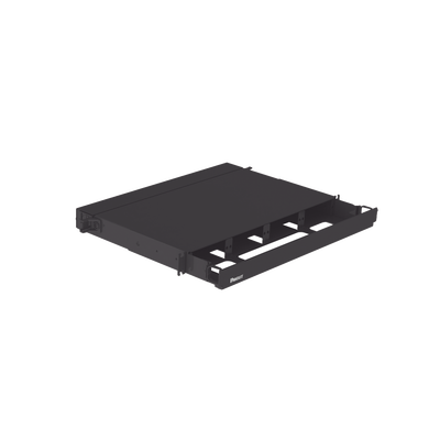 Panel de distribución FRE1UBL 1U en acero, mide 17.6 pulgadas y acepta hasta 96 fibras. Color negro y 4 ranuras para casetes/FAP. Su diseño incluye cajones extraíbles para facilitar el acceso a las fibras, ideal para la organización de redes de telecomunicaciones.