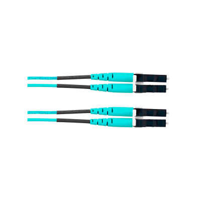 Jumper de fibra óptica multimodo FZ2ERLNLNSNM030 50/125 OM4 LC Duplex de 30 metros, diseñado para interconexiones. Clasificación Riser (OFNR), tipo de fibra OM4, conexiones LC Duplex, color aqua, y durabilidad de 500 ciclos.