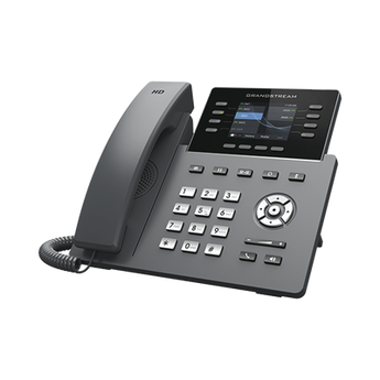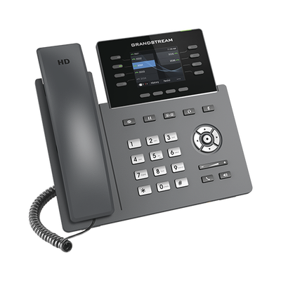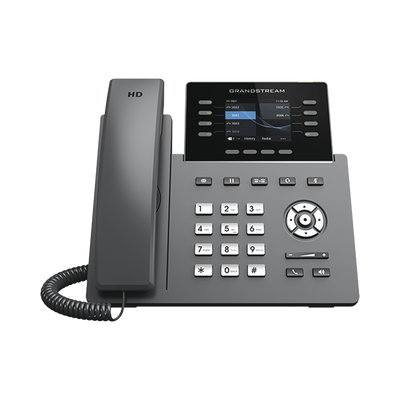 Teléfono IP GRP2624, 8 líneas SIP, 4 cuentas SIP, pantalla a color de 2.8%22. Con puertos Gigabit Ethernet y PoE integrado, este dispositivo es ideal para oficinas que requieren conectividad avanzada y máxima claridad de audio gracias a su sonido Full HD.