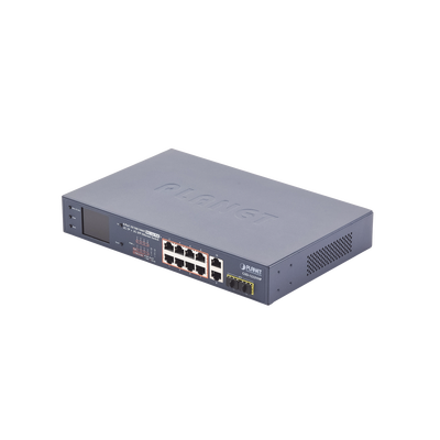 Switch no administrable GSD-1222VHP 8 puertos gigabit 120 vatios poe 250 m modo extender instalación rápida. Este modelo cuenta con 8 puertos 10/100/1000BASE-T RJ45, 2 puertos SFP y permite alimentación PoE de hasta 32 vatios por puerto. Su modo extender ofrece una alimentación remota de hasta 250 m y cumple con el estándar IEEE 802.3af. Además, proporciona protección de circuito para evitar interferencias de potencia entre puertos y facilita la gestión de dispositivos PoE.