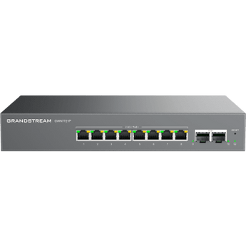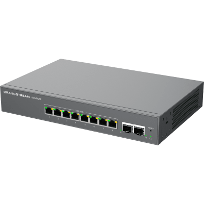 Switch de red GWN7721P 10 puertos 40Gbps 2.5G Ethernet PoE+ 802.3af/at administración remota, con 8 puertos Ethernet de 2.5 Gigabits y 2 puertos SFP+ de 10 Gigabits. Ofrece un throughput total sin bloqueo de 40Gbps, una capacidad de switching de 80Gbps y soporte para VLAN y QoS, ideal para optimizar el rendimiento de la red.
