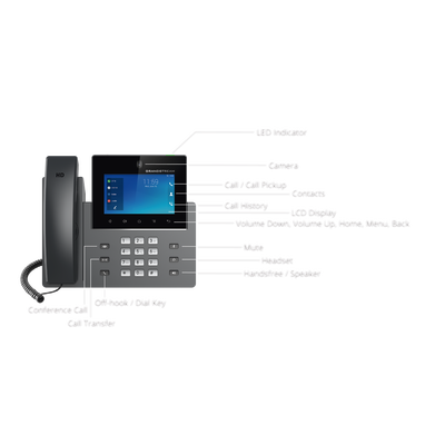 Videoteléfono IP GXV-3350 con pantalla táctil de 5%22 y sistema Android 7, cuenta con 16 líneas SIP, cámara CMOS de 1MP, doble puerto Gigabit, Bluetooth y PoE. Ideal para videollamadas de alta calidad y trabajo remoto.