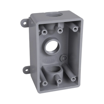 Caja impermeable HUB-PSB-37550-GY, con diseño compacto y color gris. Montaje en caja, fabricada en plástico resistente, cuenta con 3 salidas y una profundidad de 2 in, compatible con tuberías de 1/2%22 y 3/4%22. Ideal para facilitar la instalación y optimizar el espacio.