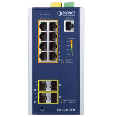 Descubre el Switch Industrial Administrable IGS-5225-8P4S de PLANET: 8 puertos RJ45 Gigabit Ethernet PoE+ (36W/p), 2 puertos SFP 100/1000BASE-X y 2 puertos SFP 100/1000/2500BASE-X. Ideal para entornos industriales, ofrece gestión a través de web y CLI, control de alimentación PoE y un diseño robusto con caja de aluminio IP30.