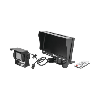 Sistema de cámara de reversa K7000B de ECCO. Monitor LCD de 7 pulgadas y cámara de infrarrojos CMOS con 18 LED. Soporta hasta dos cámaras y cuenta con una longitud de cable de 20 metros (4 pines). Este sistema profesional ofrece visualización óptima para CCTV móviles y excelente calidad de imagen en condiciones de poca luz, mejorando la seguridad al permitir visualizar áreas detrás de vehículos de trabajo y montacargas.