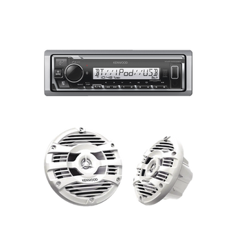 Kit de estéreo Bluetooth KMR-M332BT | más Par de bocinas KFC-1653MRW, perfecto para sistemas de audio en automóviles. Ofrece un rango de frecuencia FM de 87.9 a 107.9 MHz, incluye una pantalla de texto de 1.5 líneas y 255 segmentos, y permite reproducción de música vía Bluetooth. Con una potencia de 50 watts RMS, este kit proporciona conexión con USB y entradas auxiliares.