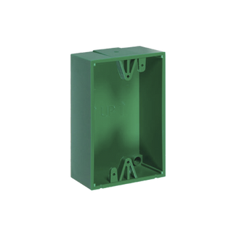 Caja trasera verde KIT-71100A-G de policarbonato, profundidad 1.5 pulgadas, ideal para montaje en superficie. Compatible con estaciones de parada STI (tipos 2, 5, 6, 7, 8 y 9). Su diseño en color verde asegura fácil identificación y su material ofrece durabilidad y resistencia. Proporciona una solución robusta y segura para estaciones de parada.