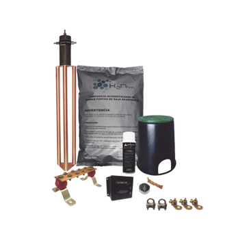 Contenido del Kit 1 Electrodo, 1 Spray protector, 1 Saco de 11 Kg de mejorador de suelo, 1 Registro para electrodo, 3 Conectores de Borne a cable, 2 Conectores de Varilla a cable, 1 Barra de unión con aisladores de 1000A, 1 Supresor clase B