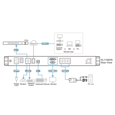 Modelo: KL1108VN | Pantalla: 19” LCD | Puertos: 8 Cat5 KVM con expansión hasta 128 dispositivos.