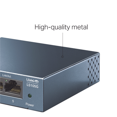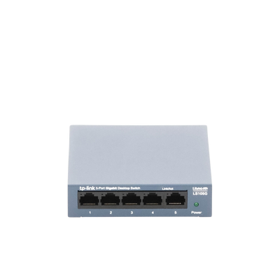 Conmutador de escritorio LS105G 5 puertos 10/100/1000mbps plug-and-play diseño metálico. Equipado con puertos RJ45 de negociación automática, sin ventilador, alimentado por adaptador externo, y con indicadores LED. Ideal para conexiones rápidas y eficientes.