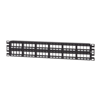 Panel de parcheo modular NKPP48FMY de 48 puertos en color negro, con 1U de espacio en rack. Fabricado en acero inoxidable con placas frontales de ABS y cuentas con números pre-impresos para fácil identificación. Cumple con estándares RoHS y ha sido probado con rendimiento al 100%25, lo que brinda confianza en todos los puertos.