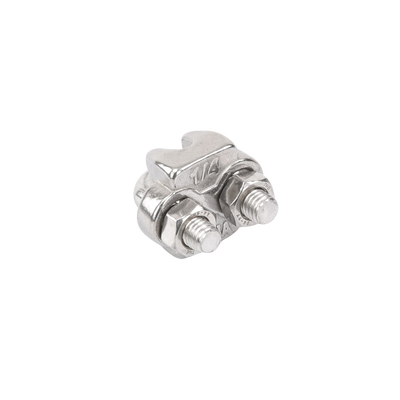 Abrazadera de acero inoxidable NUDO-14-FJSS para cable de 1/4 pulg, fabricado en acero inoxidable. Recomendado para retenida de 1/4%22 (SRET635CAM o SRET14DA), uso recomendado por amarre: 3 piezas. Ideal para carga pesada, previene la corrosión en ambientes exigentes y proporciona seguridad en la suspensión de cargas pesadas.
