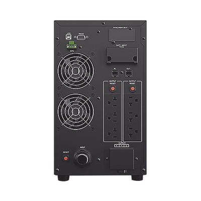 UPS 3000 VA OLS3000 salida de 2700 W tipo torre con 7 tomas (6 x NEMA 5-20R). Voltaje de entrada 120 Vac ± 10%25, salida de 120 Vac, diseño de Doble Conversión Online y cero tiempos de transferencia. Protección de equipos críticos contra cortes de energía.