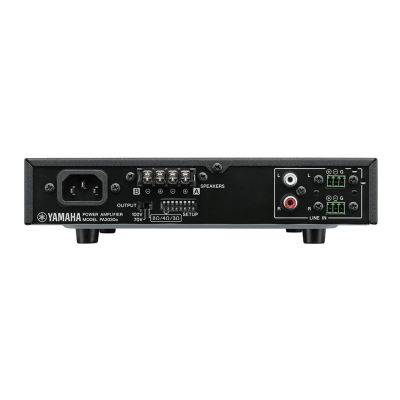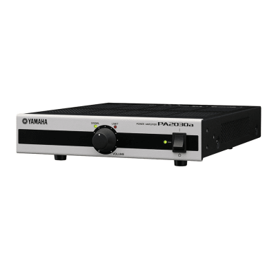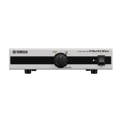 Amplificador 2 canales PA2030A de YAMAHA, con potencia de 50W por canal, y compatibilidad con baja y alta impedancia. Compacto y ligero, ofrece controles de volumen independientes y una distorsión armónica total de menos del 0.05%25. Ideal para mejorar la calidad del sonido en sistemas de audio.