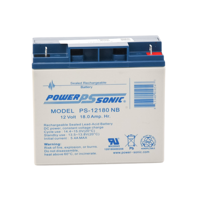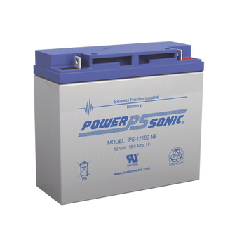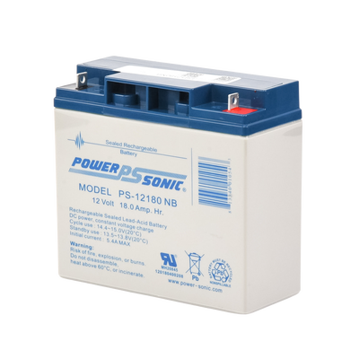 Batería 12V 18AH PS-12180-NB de Power Sonic, cuenta con terminales tipo NB. Tiene un voltaje nominal de 12V y una capacidad de 18.0AH a 20HR. Con un peso de 5.6 kg y dimensiones de 7.13%22 x 3.00%22 x 6.59%22, es libre de mantenimiento y posee tecnología AGM para garantizar un rendimiento superior y una vida útil de 5 años.